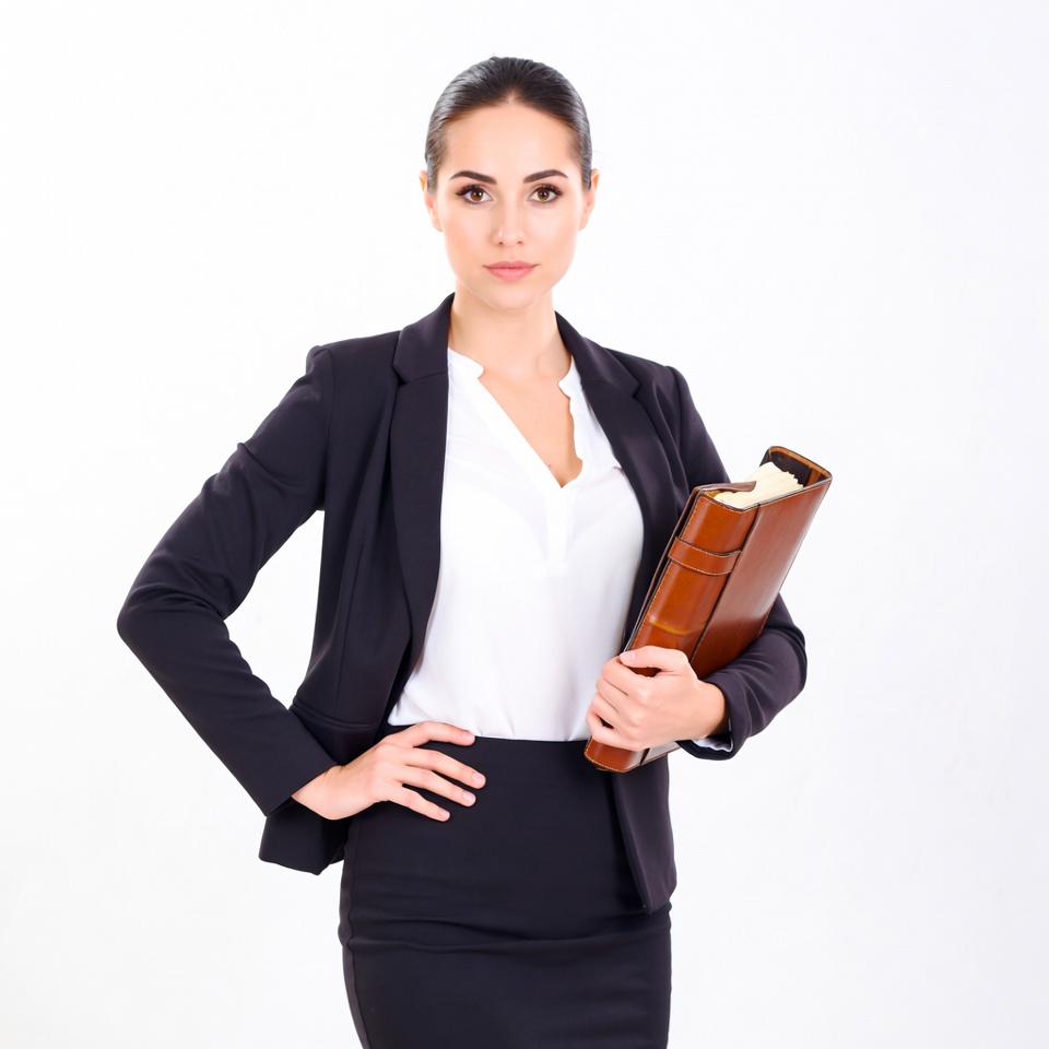 A young woman with dark hair in a bun stands confidently against a white background. She wears a black blazer, white blouse, and black skirt in a professional business outfit. She holds a brown leather folder in her right hand with her left hand on her hip.
