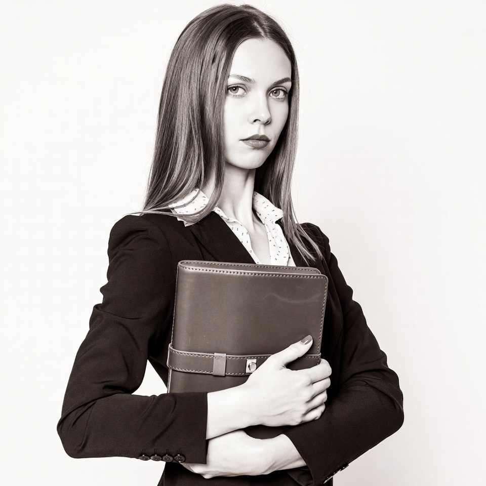 White, black and white, black blazer, business attire, collared shirt, female, holding notebook, leather notebook, long hair, portrait, sepia tone, serious expression, white background, white shirt, young woman, woman