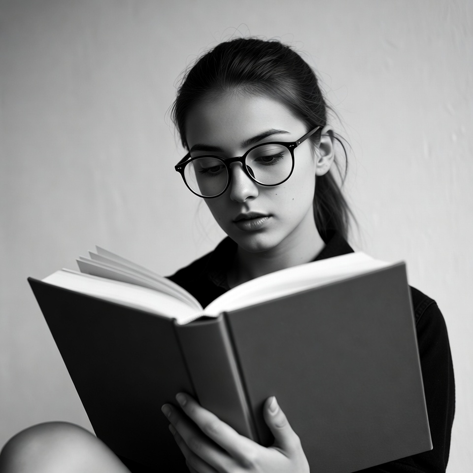 A young woman with dark hair tied in a ponytail and wearing black-framed glasses reads an open book intently. She is dressed in a dark sweater and sits with her legs tucked under her against a plain white background. The image is captured in black and white.