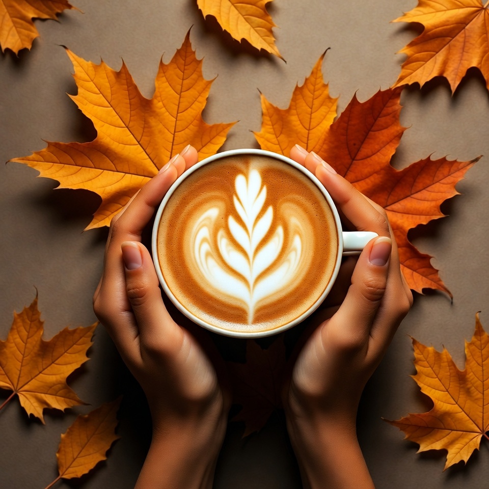 A pair of hands holds a white cup of latte topped with intricate white leaf-shaped latte art. The cup is surrounded by scattered orange autumn maple leaves on a neutral beige background. The composition is a close-up flat lay emphasizing fall colors and coffee details.