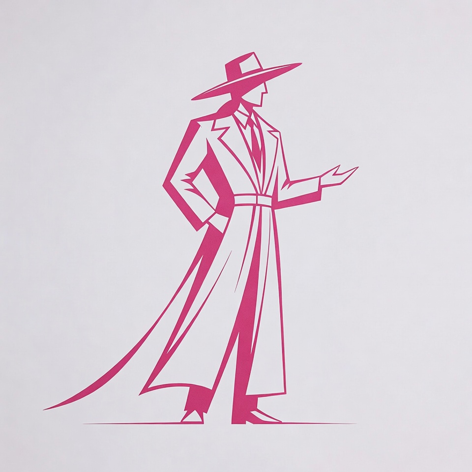 A pink silhouette illustration of a man stands confidently on a white background. He wears a wide-brimmed hat, long trench coat, tie, and pants, with one hand in his pocket and the other extended outward. The design features clean lines and a stylish detective pose.