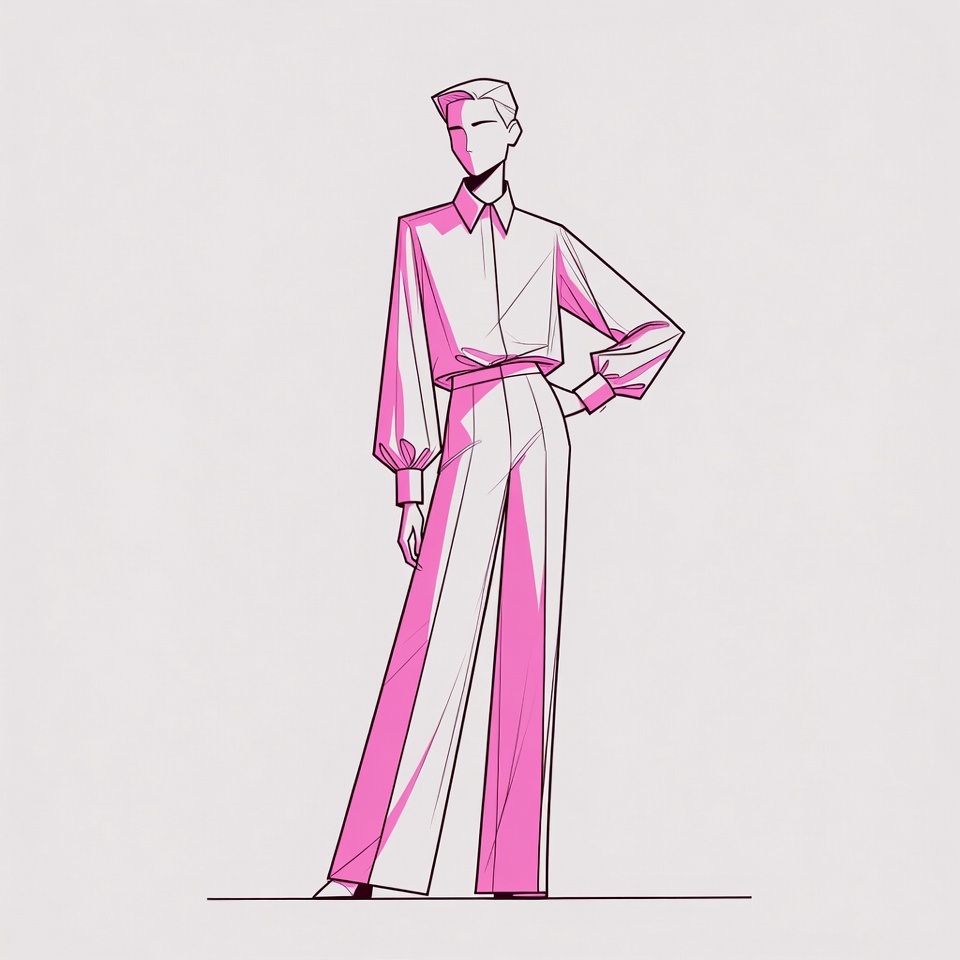 clipart, collared shirt, confident pose, fashion, hand on hip, illustration, isolated background, line art, male, pink pants, puffy sleeves, standing pose, stylish, suit, vector art, white shirt, wide-leg pants, man