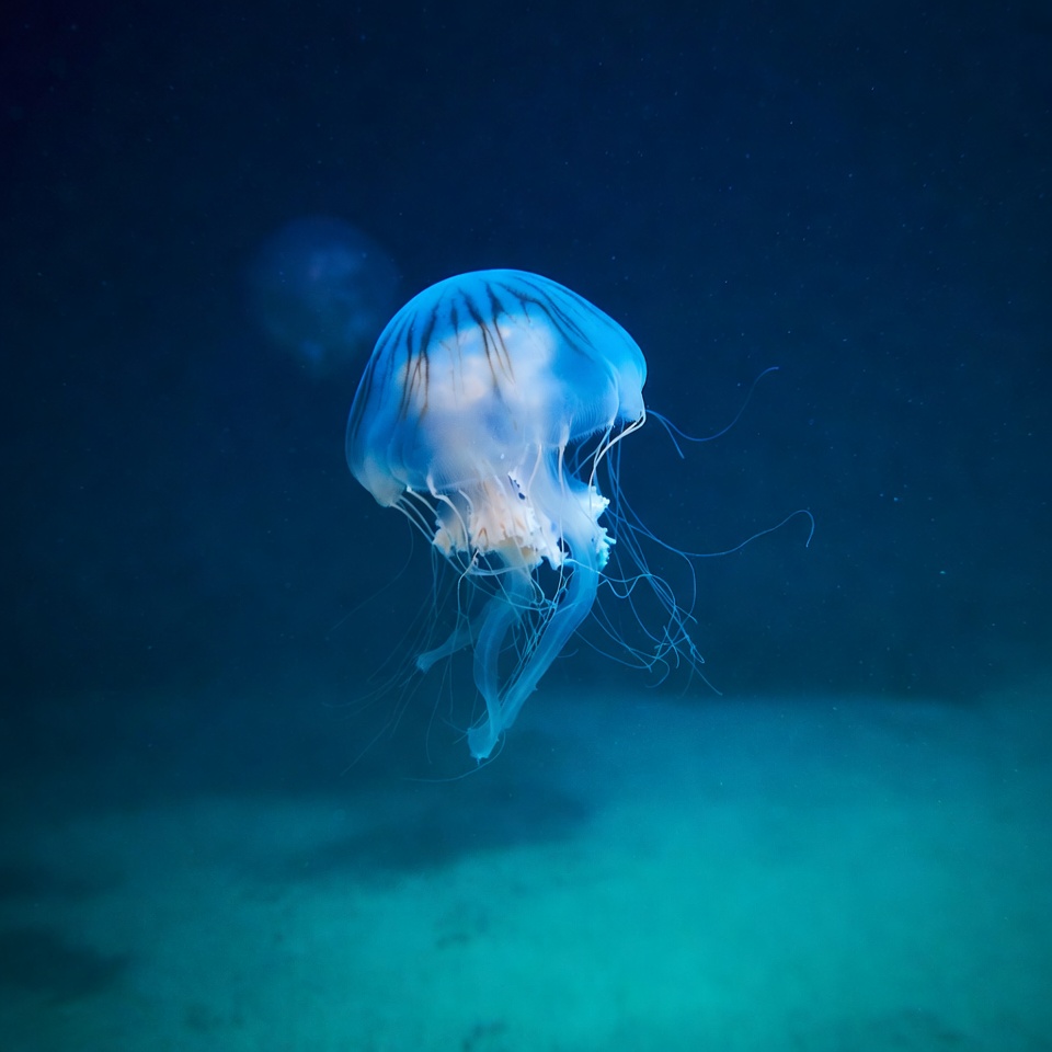 aquarium, aquatic animal, bioluminescent, blue water, dark ocean, deep sea, floating jellyfish, glowing jellyfish, jellyfish bell, marine life, ocean, ocean depth, sea creature, tentacles, trailing tentacles, translucent, underwater, jellyfish
