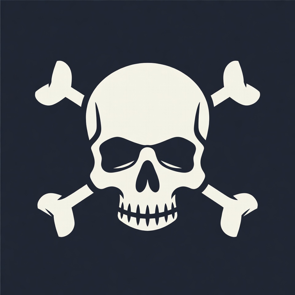 A white skull and crossbones illustration on a dark navy background. The skull features hollow eye sockets and a grinning mouth with teeth. The crossed bones are positioned directly beneath the skull.
