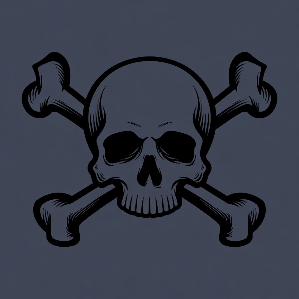 A black skull and crossbones illustration on a dark gray background. The skull features prominent eye sockets and teeth, with two crossed bones beneath it. The design is bold and outlined in a graphic style.