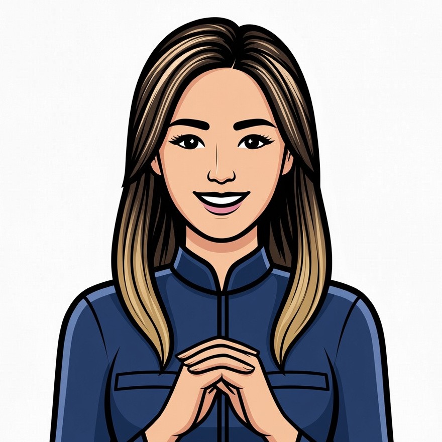 A cartoon illustration of an Asian woman with long blonde-highlighted hair smiling warmly. She wears a blue collared top and has her hands clasped together in front of her chest. The image features a clean white background.