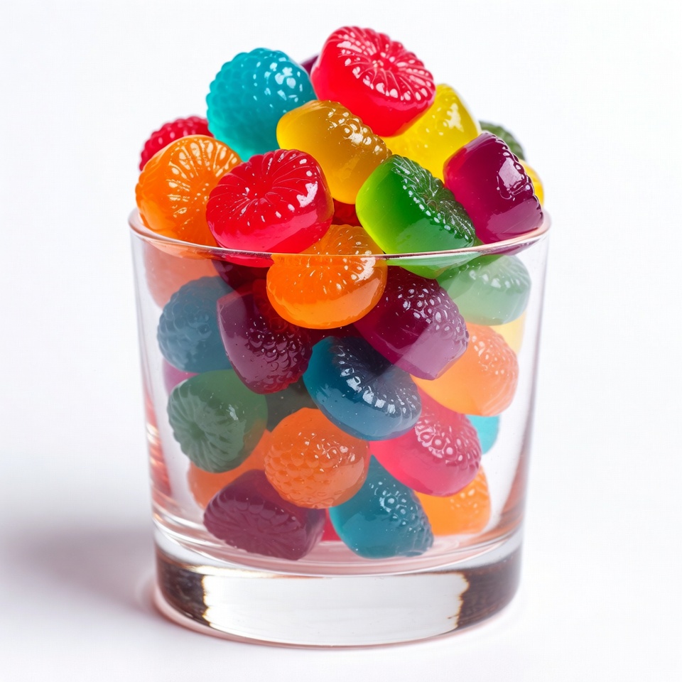 A clear glass cup overflows with vibrant gummy candies in red, blue, green, yellow, orange, and purple hues. The candies feature textured surfaces and are piled high against a plain white background. The glass cup is transparent, showcasing the colorful assortment inside.
