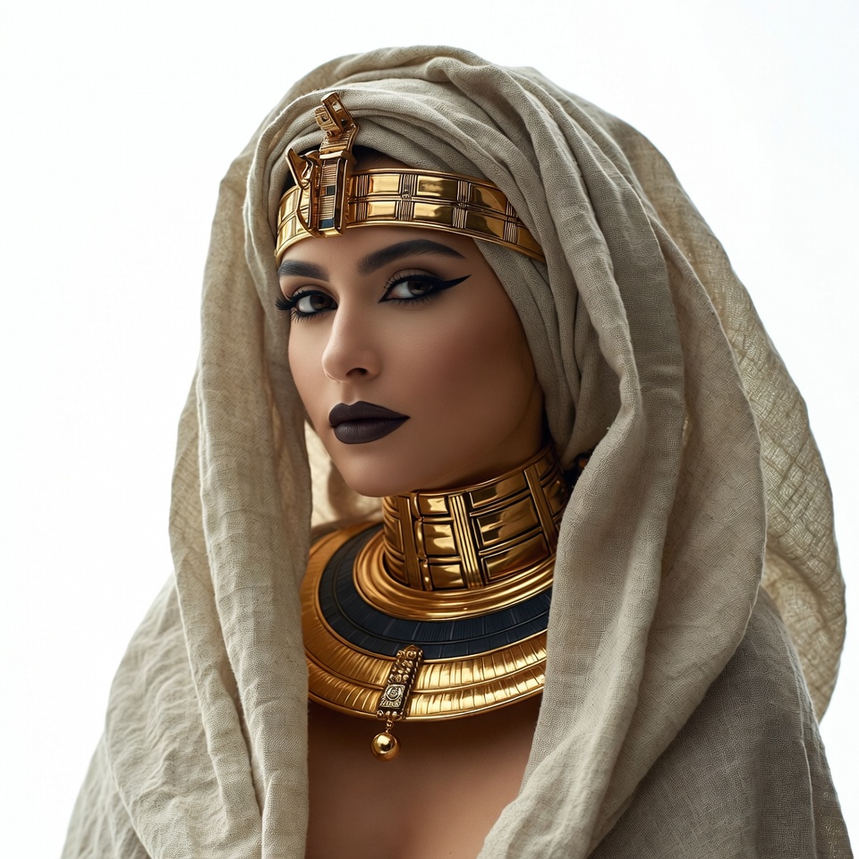 Middle Eastern, ancient Egyptian, closeup face, collar necklace, dark lipstick, draped fabric, female, gold jewelry, headpiece, isolated background, kohl eyeliner, ornate gold, portrait, white headscarf, Egyptian woman