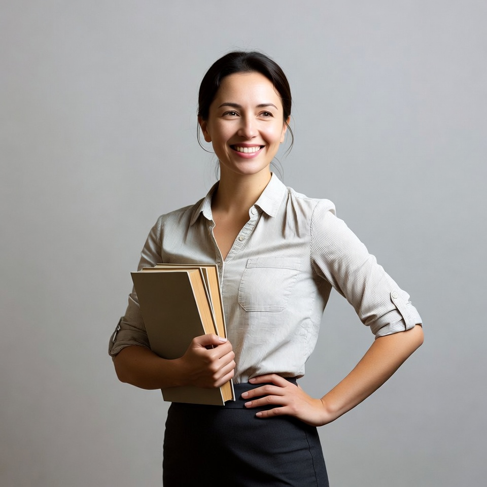 A smiling Asian woman with dark hair stands confidently against a gray background, holding a stack of three brown books in her arms. She wears a light gray collared shirt with rolled sleeves, a black pencil skirt, and has her hand on her hip. Her expression is happy and professional.