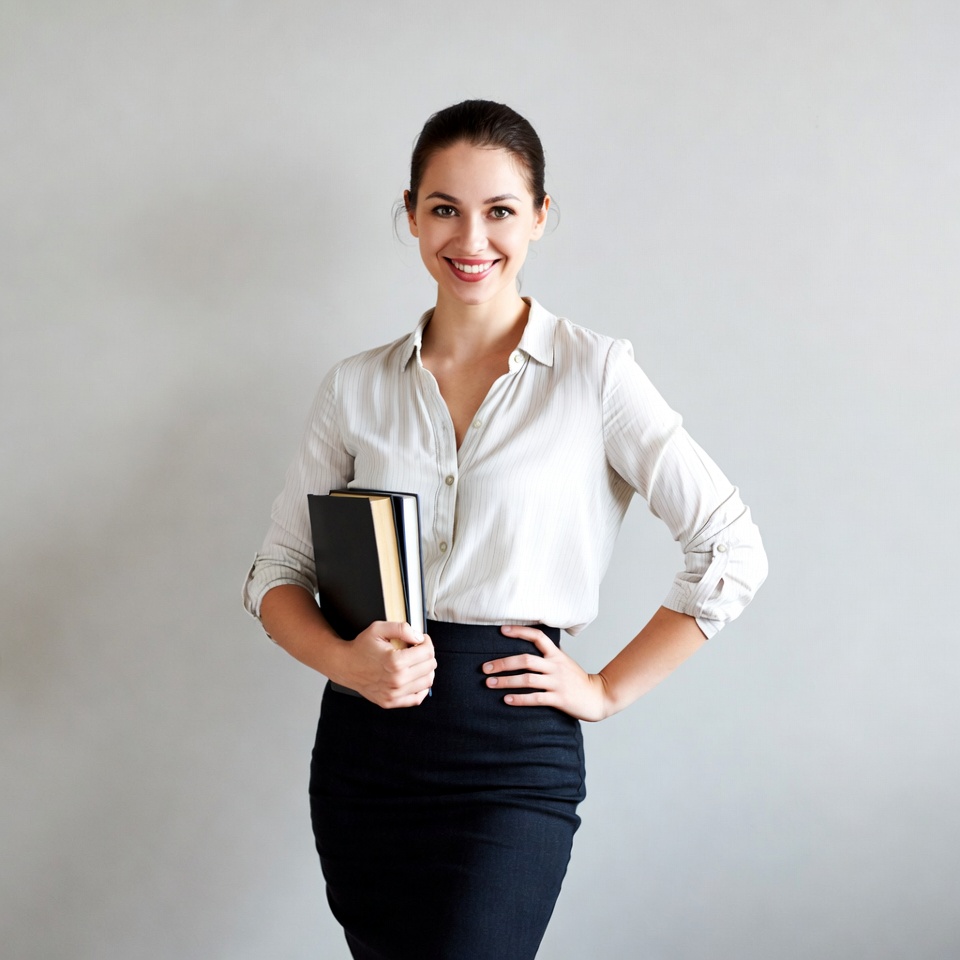 A young woman with dark hair in a bun stands confidently against a plain gray background. She wears a white collared blouse with rolled sleeves and a black pencil skirt. She holds two thick black books against her chest and smiles warmly at the camera.