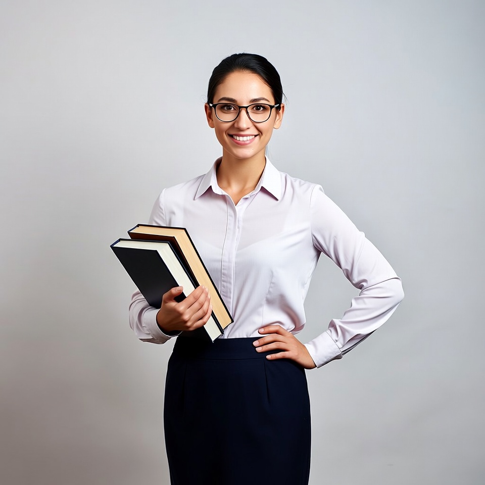 A smiling Asian woman with dark hair in a bun and glasses stands confidently against a plain gray background. She wears a white collared shirt tucked into a navy pencil skirt and holds a stack of three books in her hands. Her hand rests on her hip in a professional pose.