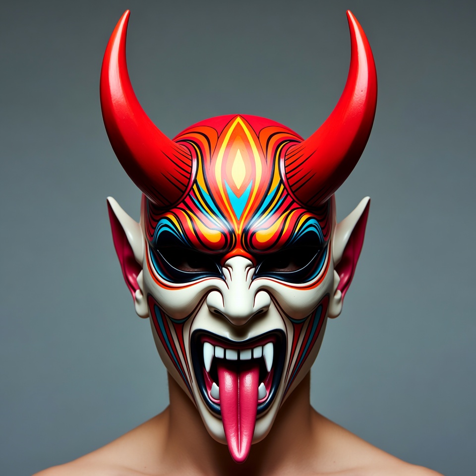 Asian, Halloween, Japanese demon, Oni mask, bare shoulders, costume, devil mask, fangs, fantasy, fierce expression, gray background, horns, intricate design, male, man, masquerade, pointed ears, red mask, scary, supernatural, tongue, vibrant colors, white skin, demon mask
