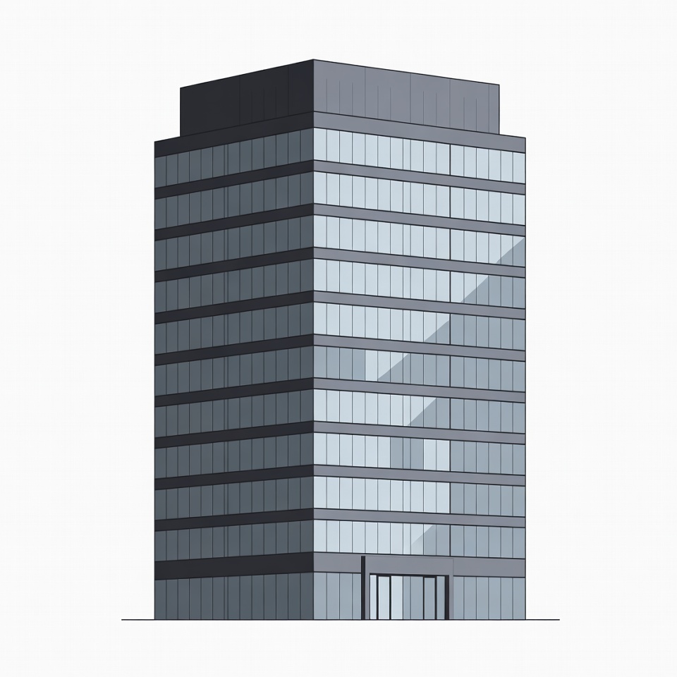 A tall modern skyscraper with a dark flat roof and multiple floors of glass windows stands on a white background. The building features a reflective glass facade and a prominent glass entrance at the base. It is depicted in a clean line art illustration style.