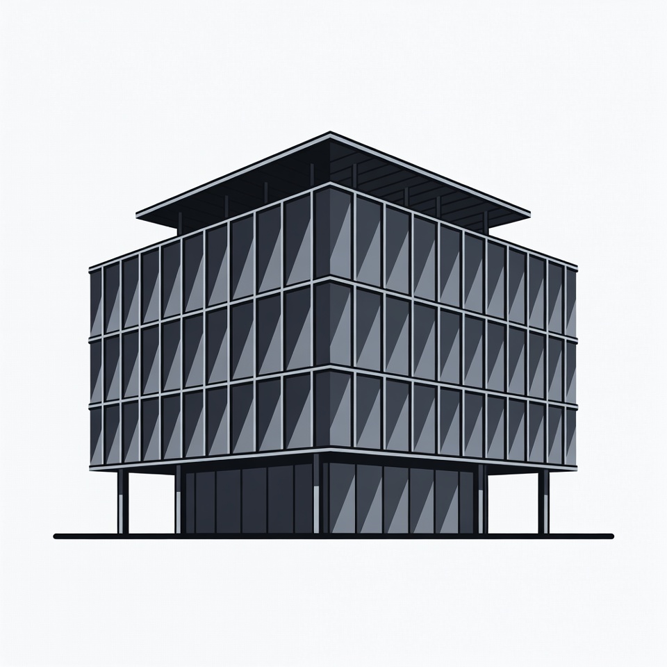A minimalist vector illustration of a modern multi-story office building with extensive glass windows and a flat roof. The structure features a grid of dark-tinted glass panels on all sides and is elevated on slim supports. It is depicted from a three-quarter corner view against an isolated white background.