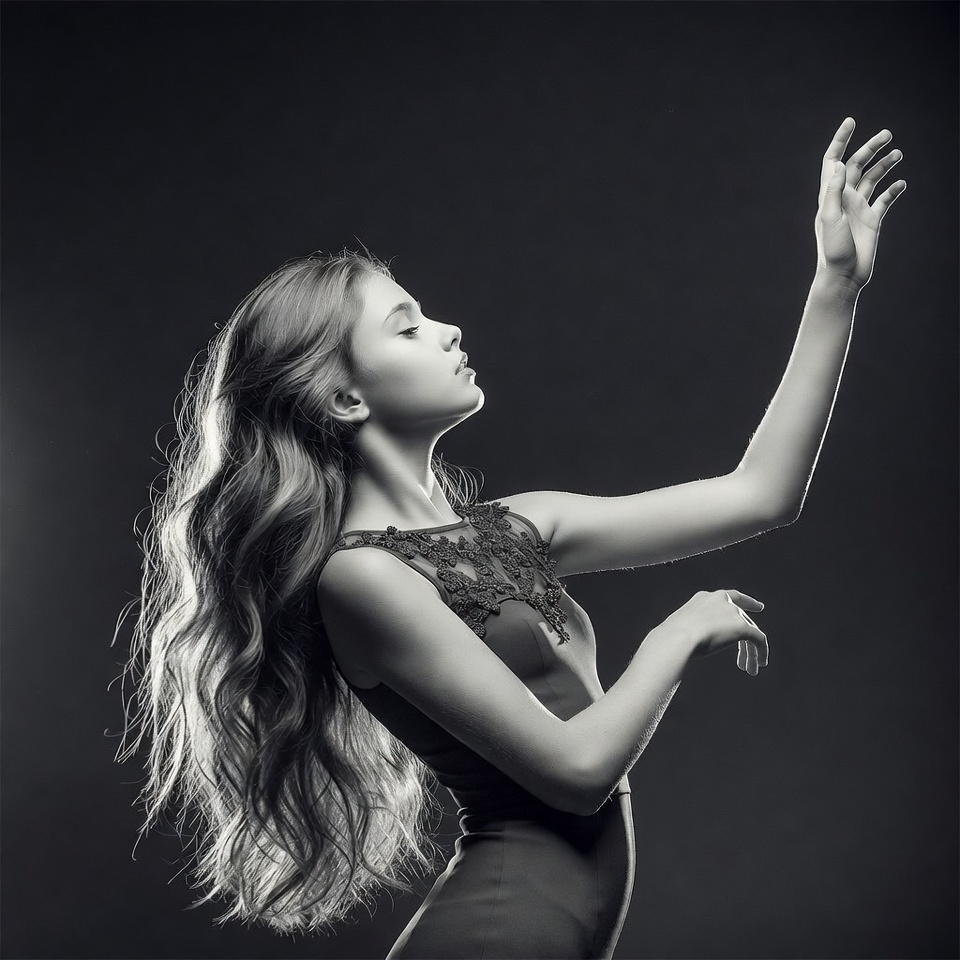 arms extended, black and white, black dress, closed eyes, dancing pose, elegant, female, graceful pose, lace dress, long hair, monochrome, portrait, raised arm, side profile, studio shot, tilted head, wavy hair, young girl, girl