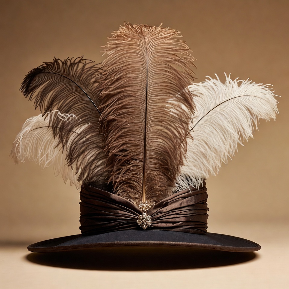 black hat, brown feathers, brown hat, decorative feathers, elegant hat, fancy hat, fashion accessory, feathers, headwear, isolated background, jewel decoration, millinery, ostrich feathers, plume hat, silk band, velvet hat, vintage hat, white feathers, wide brim hat, hat