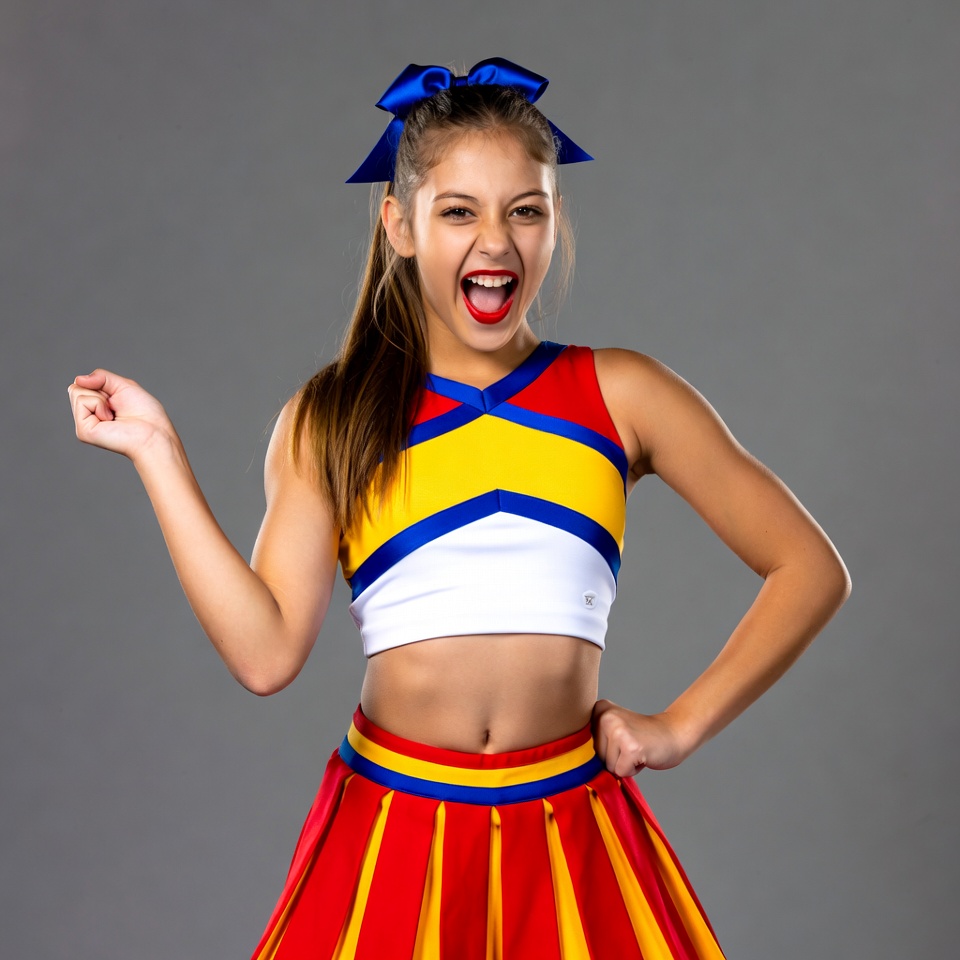 A young girl with long brown hair tied in a blue bow wears a red, yellow, blue, and white cheerleader uniform. She stands on a gray background with her mouth open wide in excitement, one hand raised in a fist and the other on her hip. Her short pleated skirt flares out as she poses energetically.