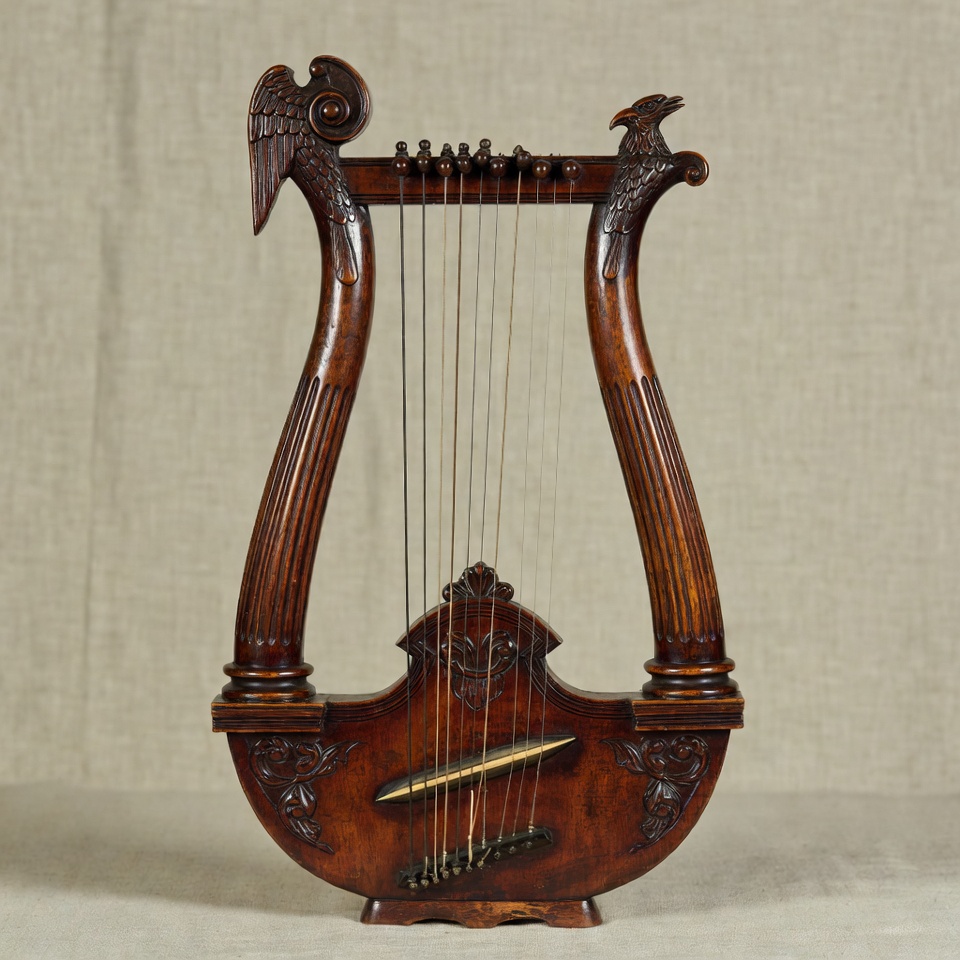 Greek lyre, ancient lyre, carved wood, classical music, eagle heads, harp-like, isolated background, musical instrument, mythology, ornate carvings, strings, vintage instrument, wooden lyre, lyre