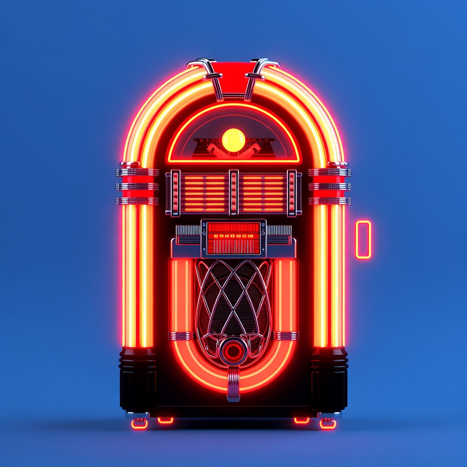A vibrant retro jukebox with bright red neon lights outlines its arched top and sides. It features a yellow sun emblem in the upper window, metallic grilles, and glass panels on a solid blue background. The design includes ornate chrome details and glowing accents at the base.