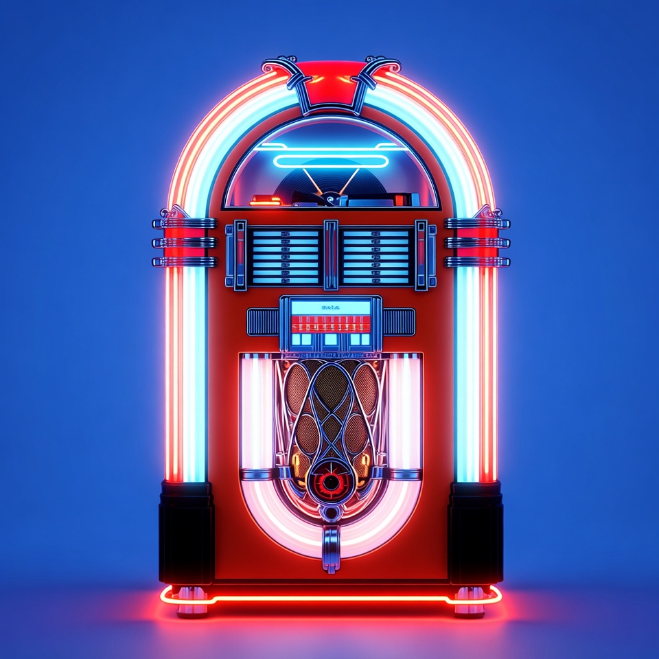 A vibrant retro jukebox features a red body with neon pink and blue lights outlining its arched top and sides. The machine displays illuminated buttons, a central screen, and glowing accents on a solid blue background. Detailed chrome elements and dynamic lighting give it a futuristic 80s vibe.