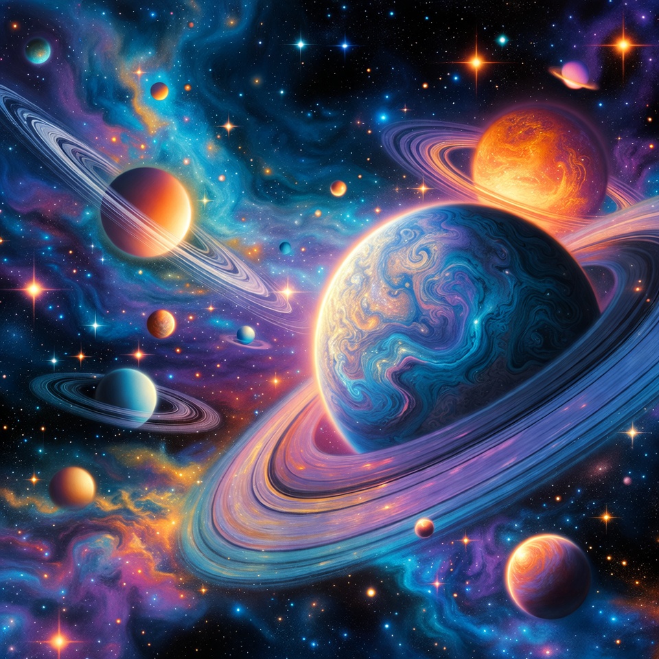 A stunning digital illustration of a colorful galaxy filled with multiple planets in various hues of blue, orange, and purple. Prominent Saturn-like planets with detailed rings orbit around a swirling blue-green world. Twinkling stars and nebulae create a dynamic, isolated space background.