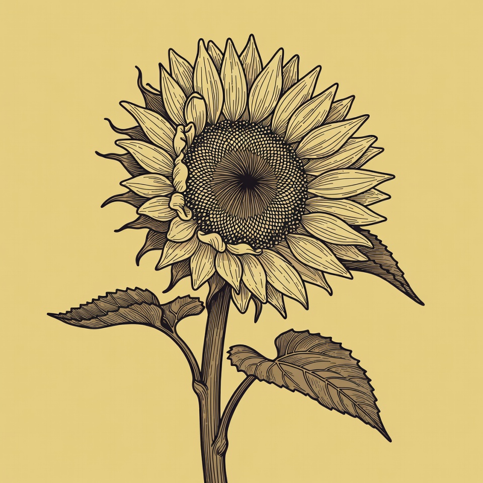 beige background, bloom, botany, detailed, drawing, floral, flower, graphic, illustration, isolated, leaves, line art, nature, petals, plant, sketch, stem, vector, yellow background, sunflower