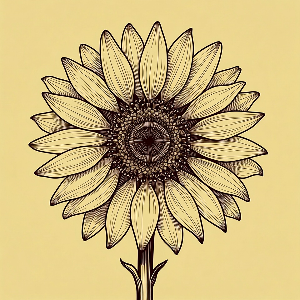A detailed line drawing of a sunflower features numerous elongated petals radiating from a textured central disk. The illustration is rendered in brown ink on a light yellow background with a thin stem at the base. It has an isolated, minimalist design.