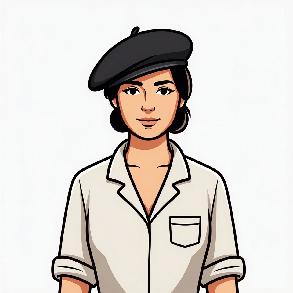 French style, beret hat, black beret, bun hairstyle, cartoon, clipart, collared shirt, dark hair, fashion, female, illustration, isolated background, portrait, rolled sleeves, smiling, stylish, vector art, white shirt, woman, Asian woman