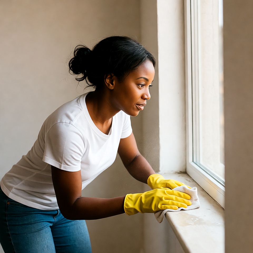 African-American, beige walls, black hair, blue jeans, bun hairstyle, cleaning window, cloth rag, female, house cleaning, household chores, indoor, leaning forward, natural light, rubber gloves, side profile, white t-shirt, window sill, wiping glass, yellow gloves, woman