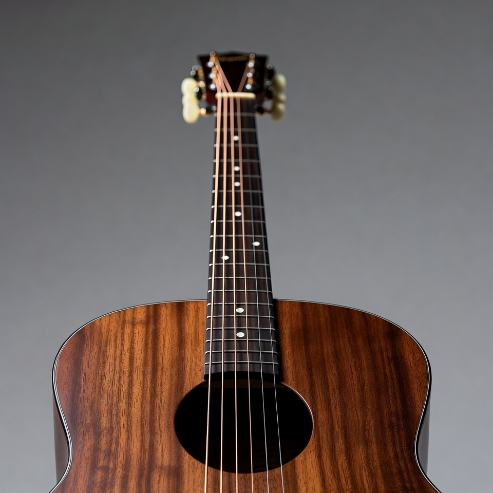 A brown koa wood acoustic guitar stands upright against a gray background. It features a sound hole, multiple strings, and cream-colored tuning pegs. The neck and body display natural wood grain patterns.