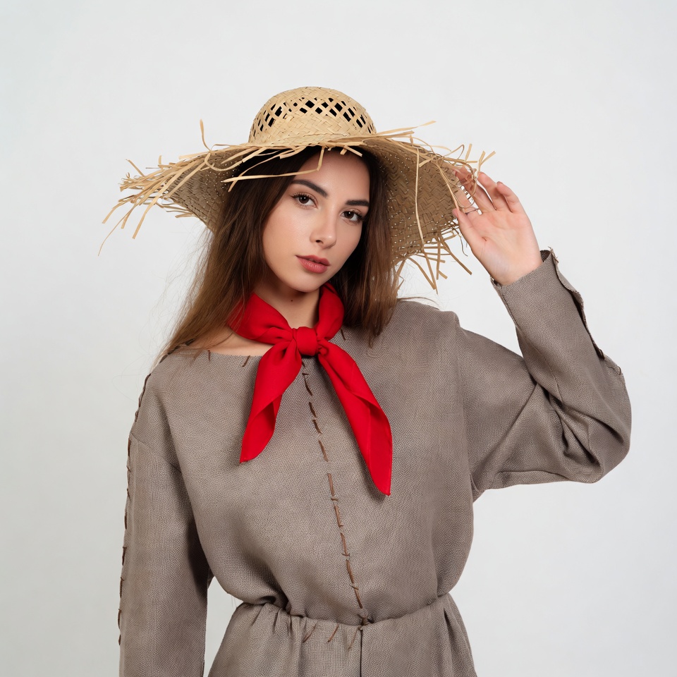 A young woman with long brown hair poses against a white background, wearing a wide-brimmed straw hat and a red scarf tied around her neck. She has a neutral expression and one hand raised to her hat. Her outfit includes a loose-fitting gray dress with stitched details.