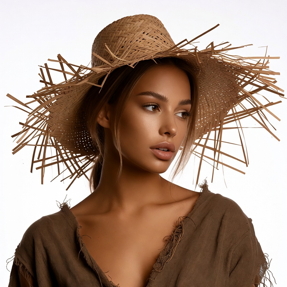 A young woman with long brown hair in a ponytail wears a wide-brimmed straw hat with frayed edges. She has a subtle smile and is dressed in a loose beige linen dress. The image is isolated on a white background.