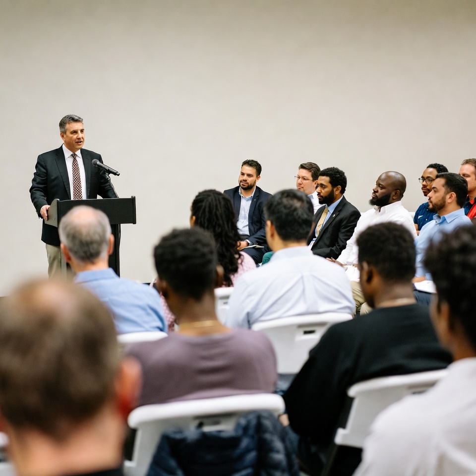 African-American, Latino, Middle Eastern, White, audience, business attire, conference, diverse group, female, gray hair, group discussion, indoor, male, meeting, microphone, podium, professional event, public speaking, seated listeners, suits, white chairs, white wall, man speaking