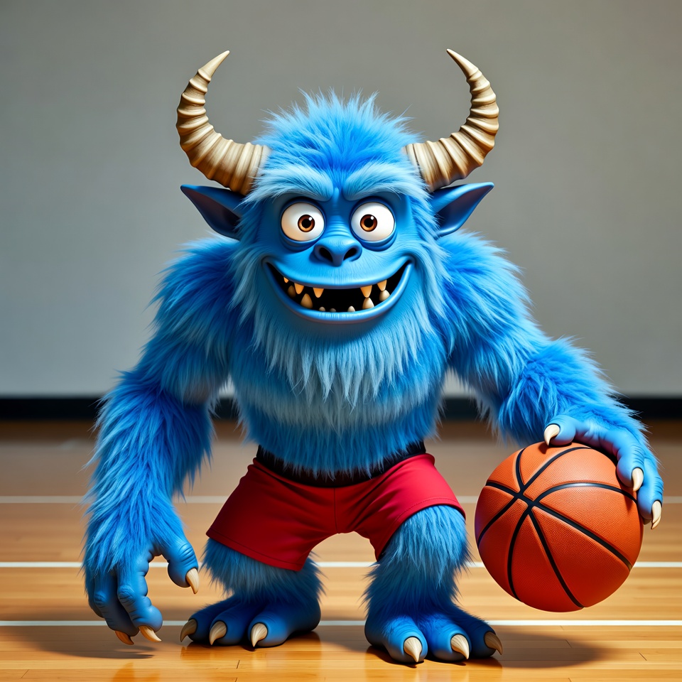 A blue furry monster with curved horns and wide eyes holds an orange basketball on a gym floor. It wears red shorts and stands with clawed feet on the wooden court. The creature grins with sharp teeth against a plain background.