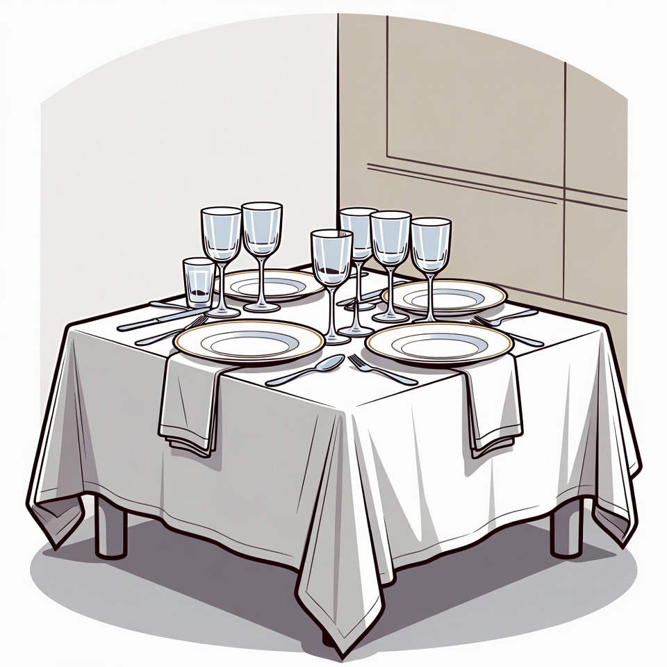 A clipart illustration depicts a square white tablecloth-covered table set for four in a dining room corner. It features white plates with gold rims, multiple clear wine glasses, water glasses, and polished silverware arranged neatly at each place setting. Napkins are folded at the corners, with beige walls and a window in the background.