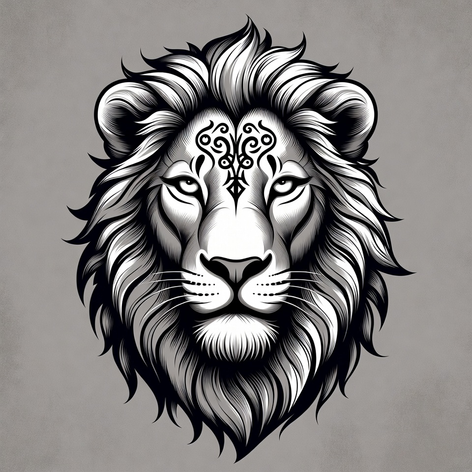 A detailed black and white illustration of a lion's face with intricate tribal patterns on its forehead. The lion features flowing mane, piercing eyes, and whiskers on a gray background. The design is bold and symmetrical, emphasizing ornate line art.