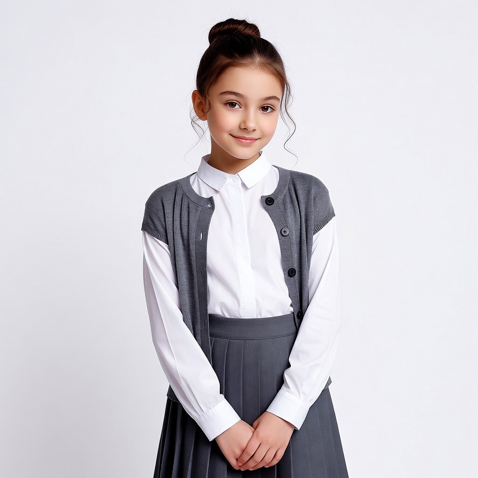 A young girl with dark curly hair in a bun stands smiling against a white background. She wears a white collared shirt under a gray buttoned cardigan and matching gray pleated skirt. Her hands are clasped in front of her.