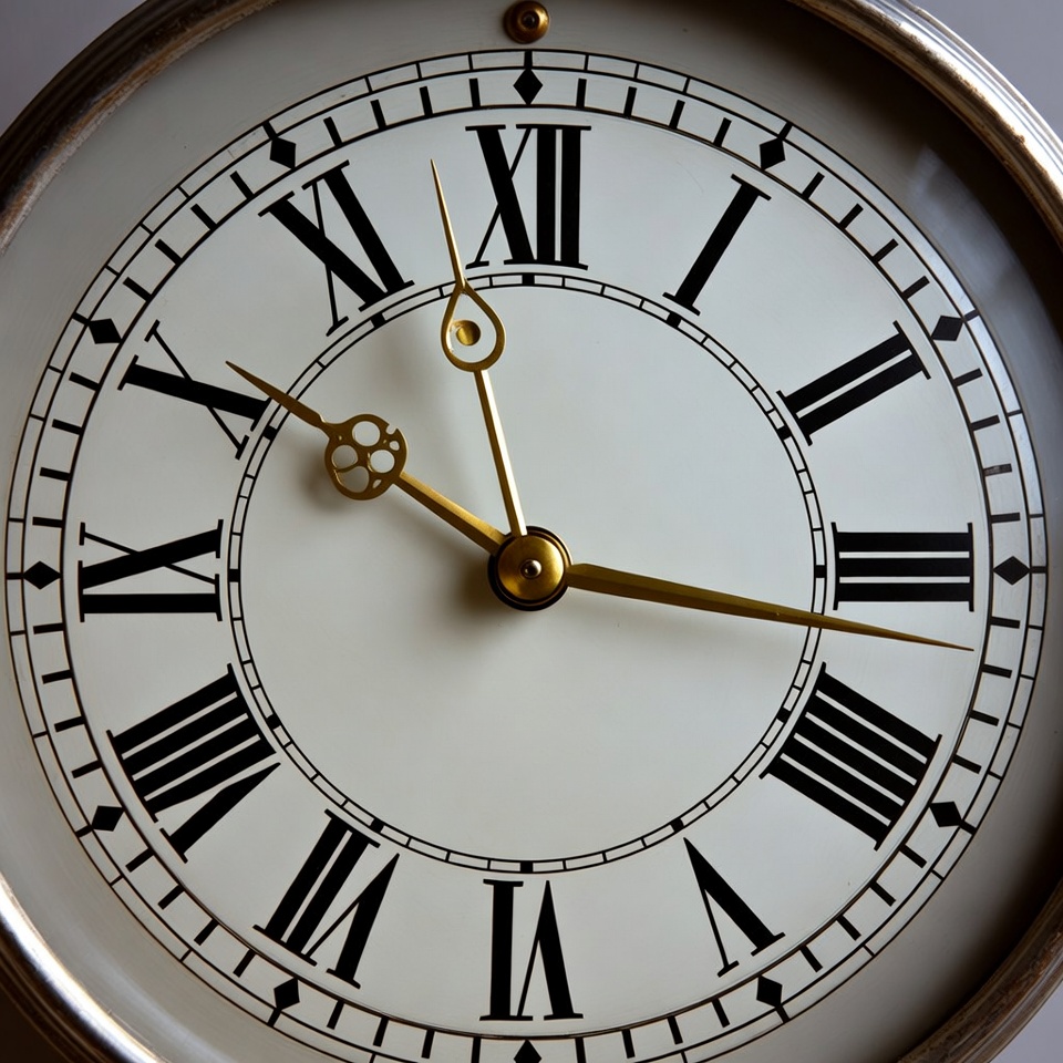 A vintage analog clock with a white dial and black Roman numerals is shown in close-up. Gold hour, minute, and second hands point to different times against the ornate markings. The clock has a silver bezel and is isolated on a plain background.