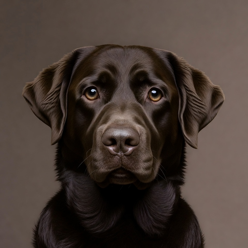 A chocolate Labrador Retriever faces forward with large expressive brown eyes and floppy ears. Its glossy brown fur is detailed against a neutral blurred background. The dog's nose and mouth are centered in the portrait-style image.