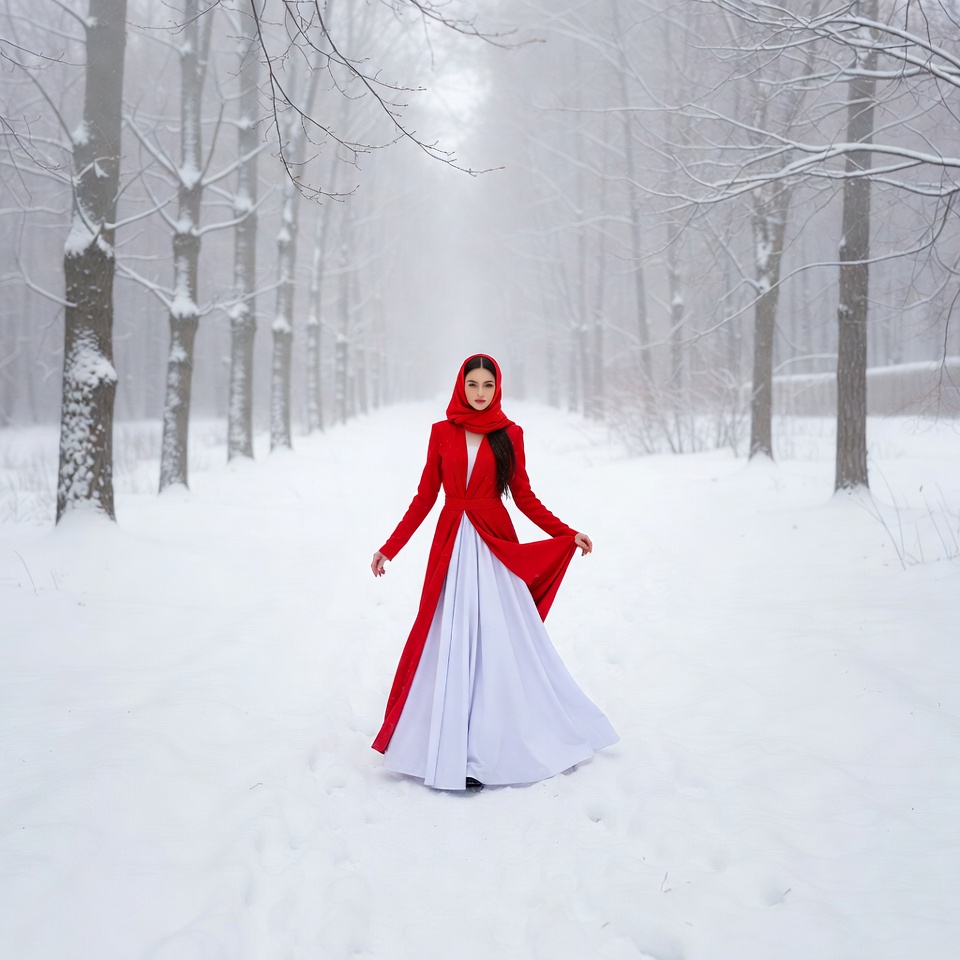 A woman with long dark hair wears a striking red coat with a white skirt, standing gracefully on a snowy path in a winter forest. Snow covers the bare trees lining the avenue, creating a misty, serene backdrop. She poses with arms extended, her coat billowing in the cold air.