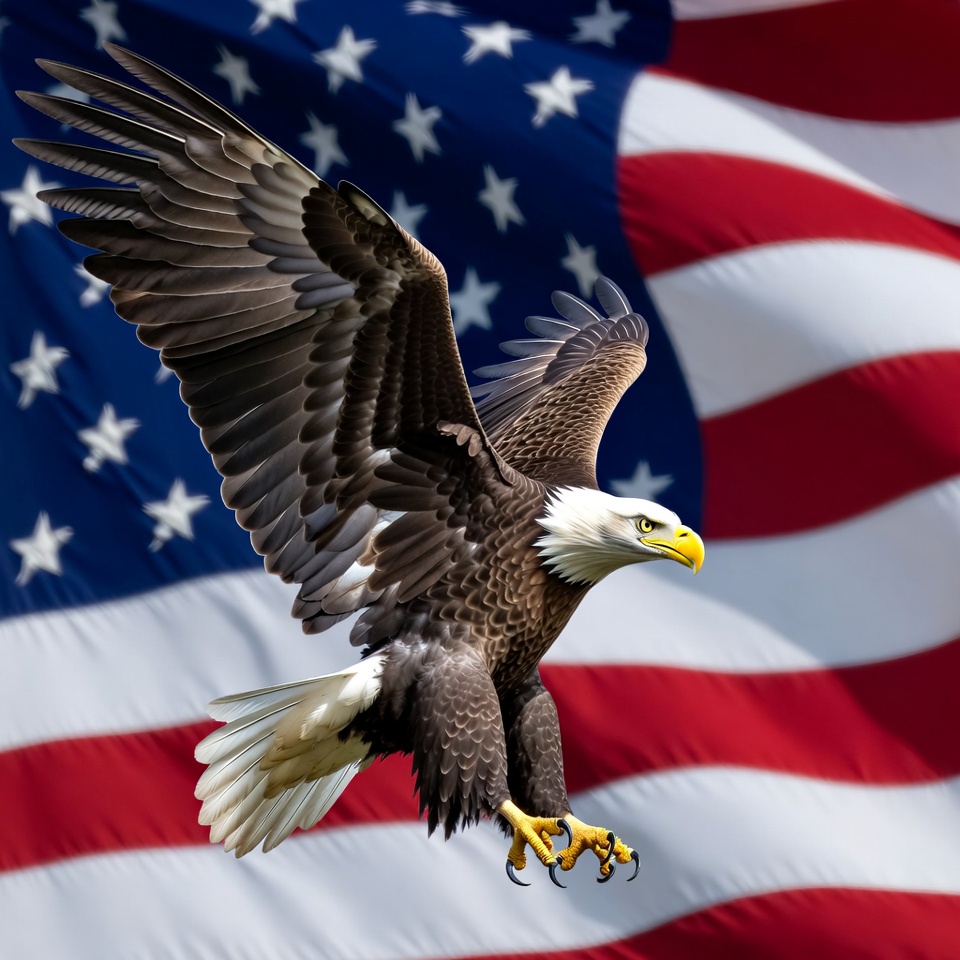 A majestic bald eagle with widespread wings soars in front of a vibrant American flag. The eagle features a white head, yellow beak, and dark brown body with talons extended. The stars and stripes of the flag create a patriotic backdrop.