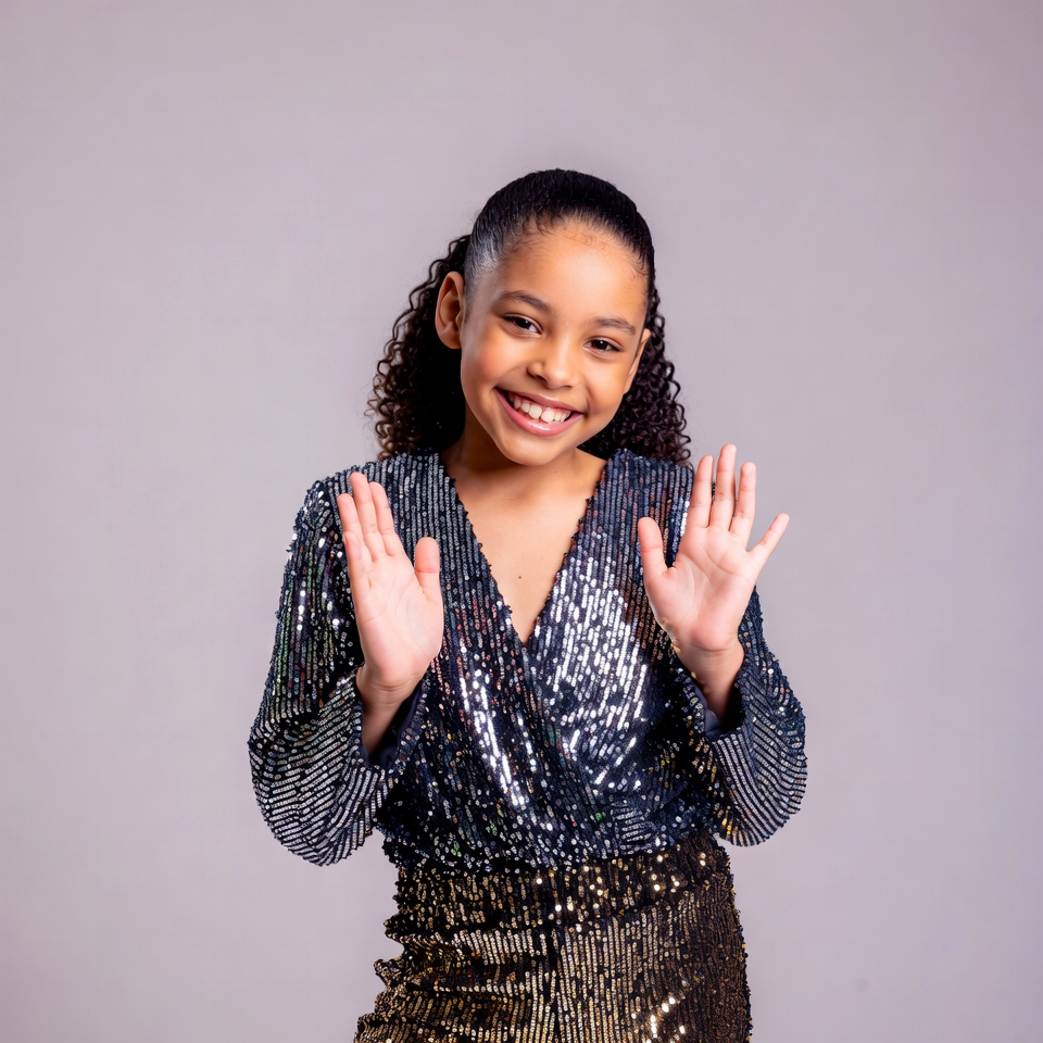 African-American, child, clapping hands, curly hair, female, hands raised, happy expression, isolated background, joyful girl, long sleeves, ponytail, portrait, sequin dress, shiny outfit, silver dress, smiling, wrap dress, young girl, girl