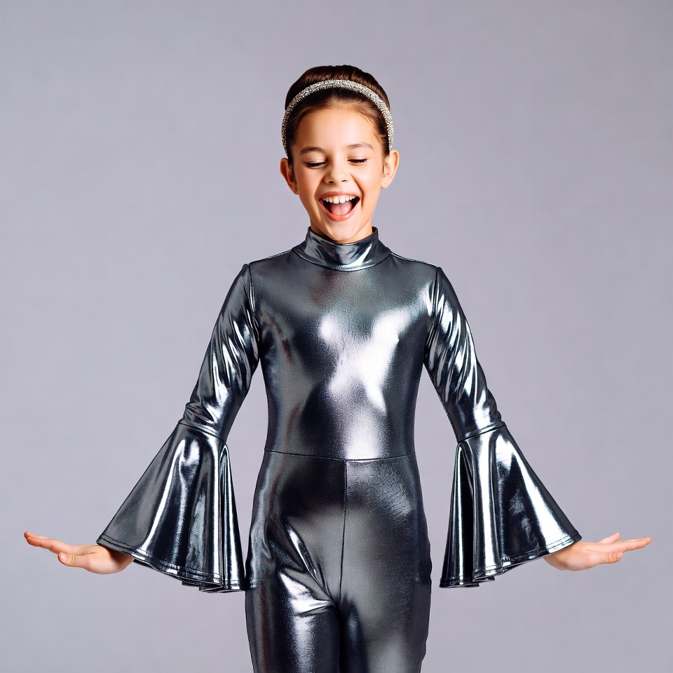 A young girl with brown hair and a sparkly headband stands smiling on a gray background. She wears a shiny metallic silver leotard with long flared sleeves and a high neckline. Her arms are outstretched in a joyful pose.