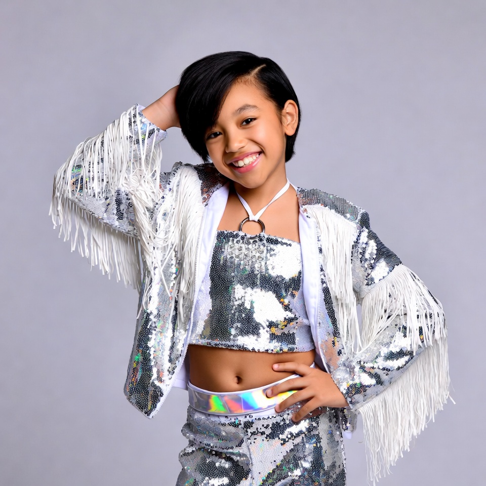 A young Asian girl with short black hair smiles confidently while posing with one hand on her head and the other on her hip. She wears a sparkling silver sequin fringe jacket over a matching cropped top and pants that reveal her midriff. The image features a plain gray background.