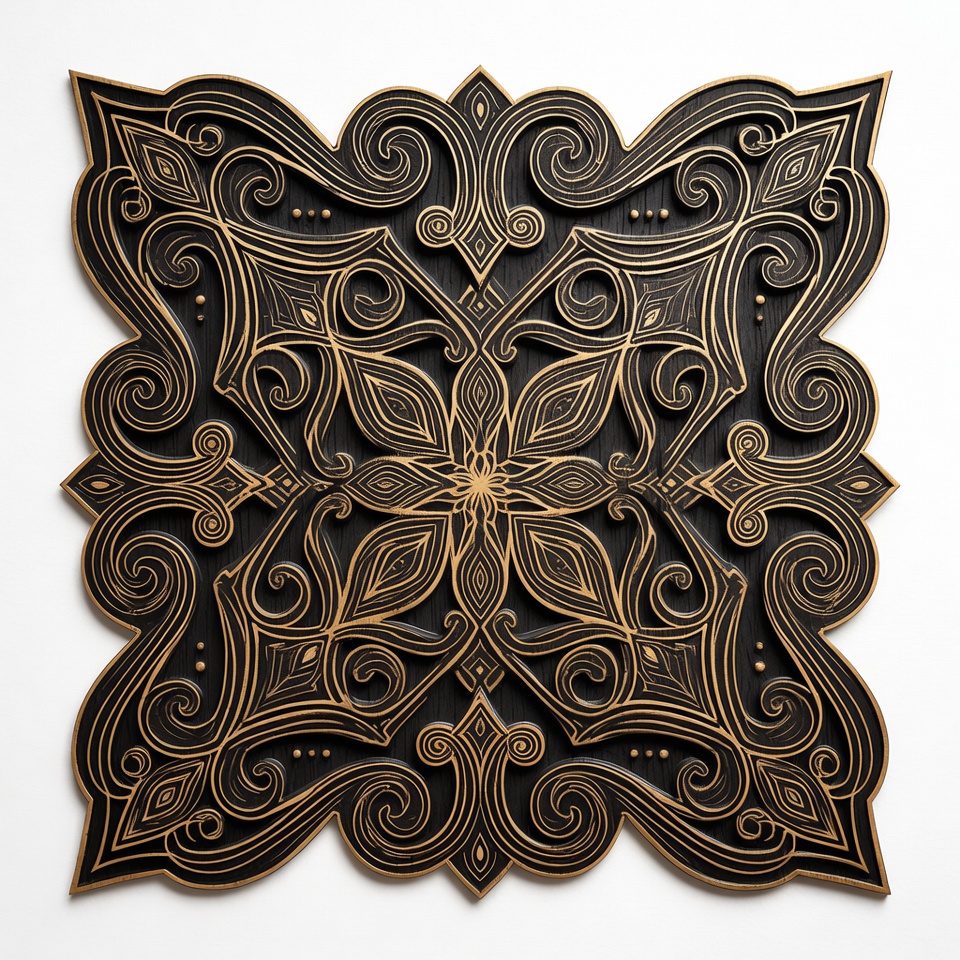 abstract pattern, artistic, black gold, border design, center flower, craftsmanship, cutout art, decorative, detailed, engraving, filigree, floral patterns, geometric, intricate, isolated background, layered, ornate design, relief art, scrollwork, square panel, swirl motifs, symmetrical, vector style, wood carving, wooden art, mandala