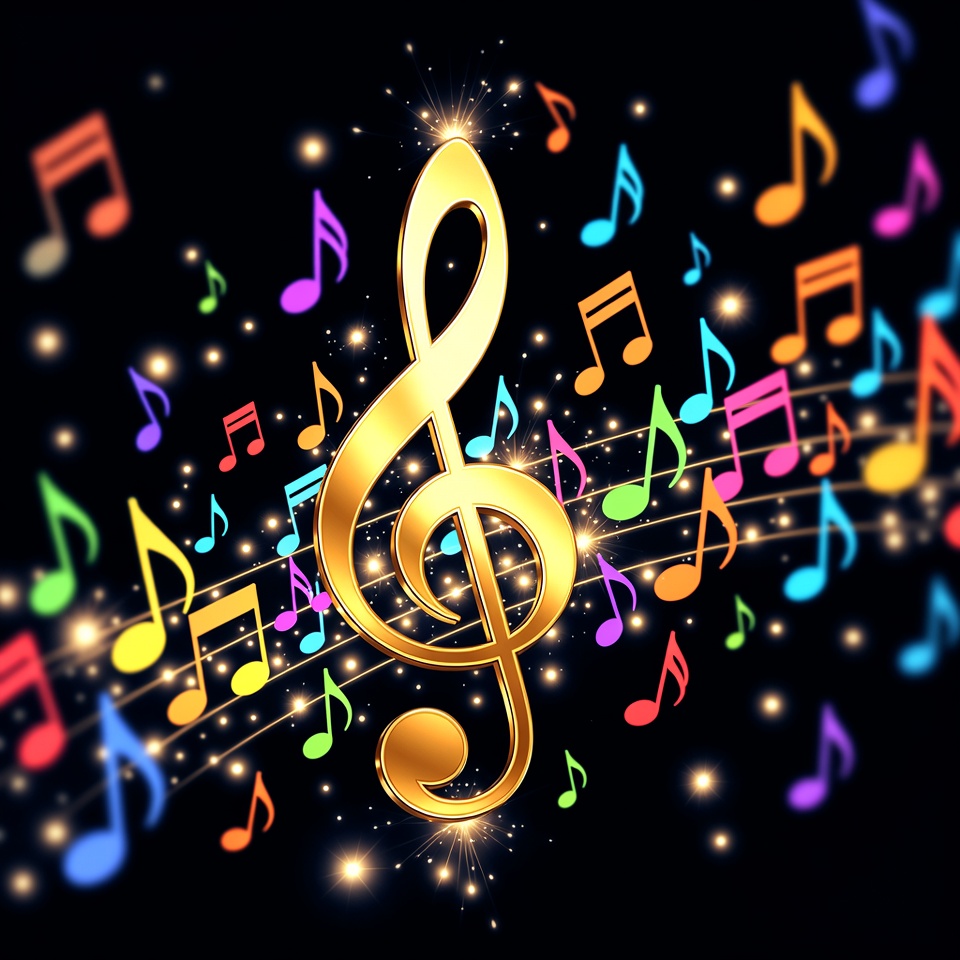 A shiny golden treble clef stands prominently in the center against a dark background. Vibrant colorful musical notes in red, blue, green, and orange swirl around it with sparkling effects. The design features a dynamic, glowing composition ideal for music themes.