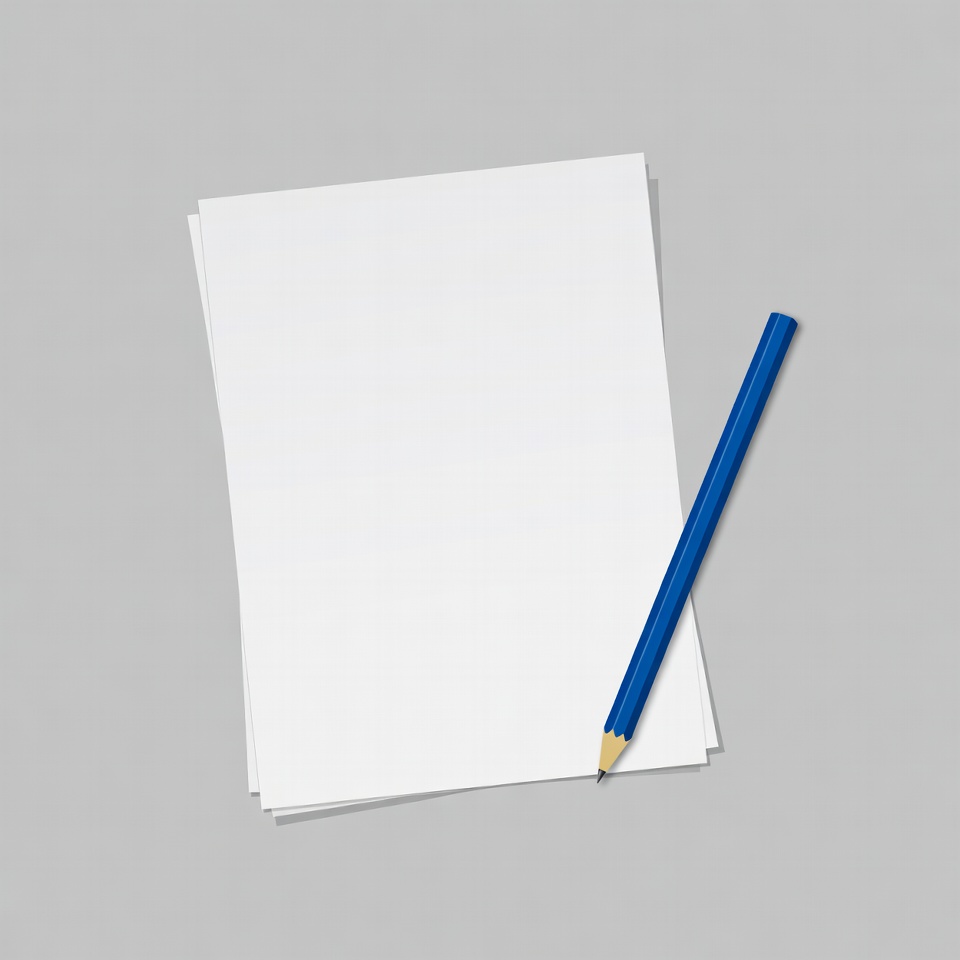 A stack of white blank papers sits on a gray background. A blue pencil with an eraser rests diagonally across the papers. The scene is simple and isolated.