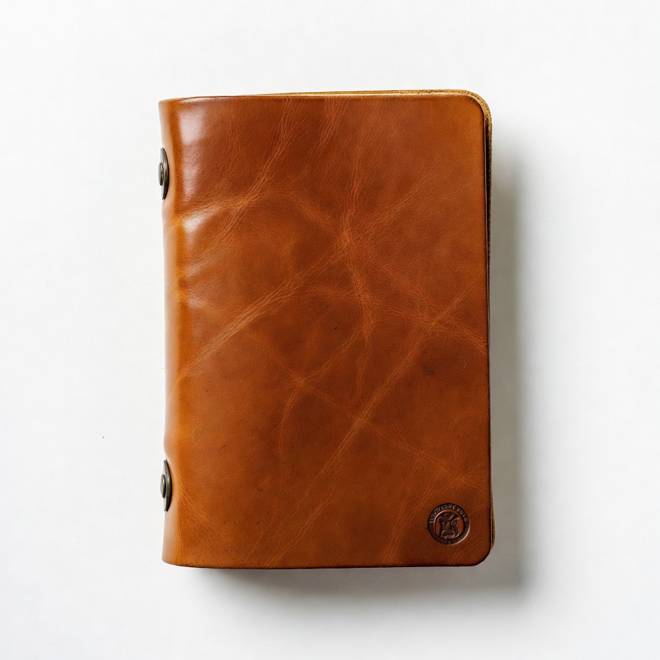 blank journal, bookbinding, brass studs, brown leather, handmade journal, isolated background, journal cover, leather bound, leather cover, leather notebook, notebook, rustic leather, snap closure, top view, white background, writing journal, leather journal