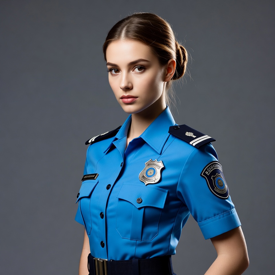 A young woman with brown hair in a bun wears a fitted blue police uniform shirt with badges and epaulets. She stands confidently against a gray background, gazing directly at the viewer. Her uniform features a shiny badge and patches on the sleeves.