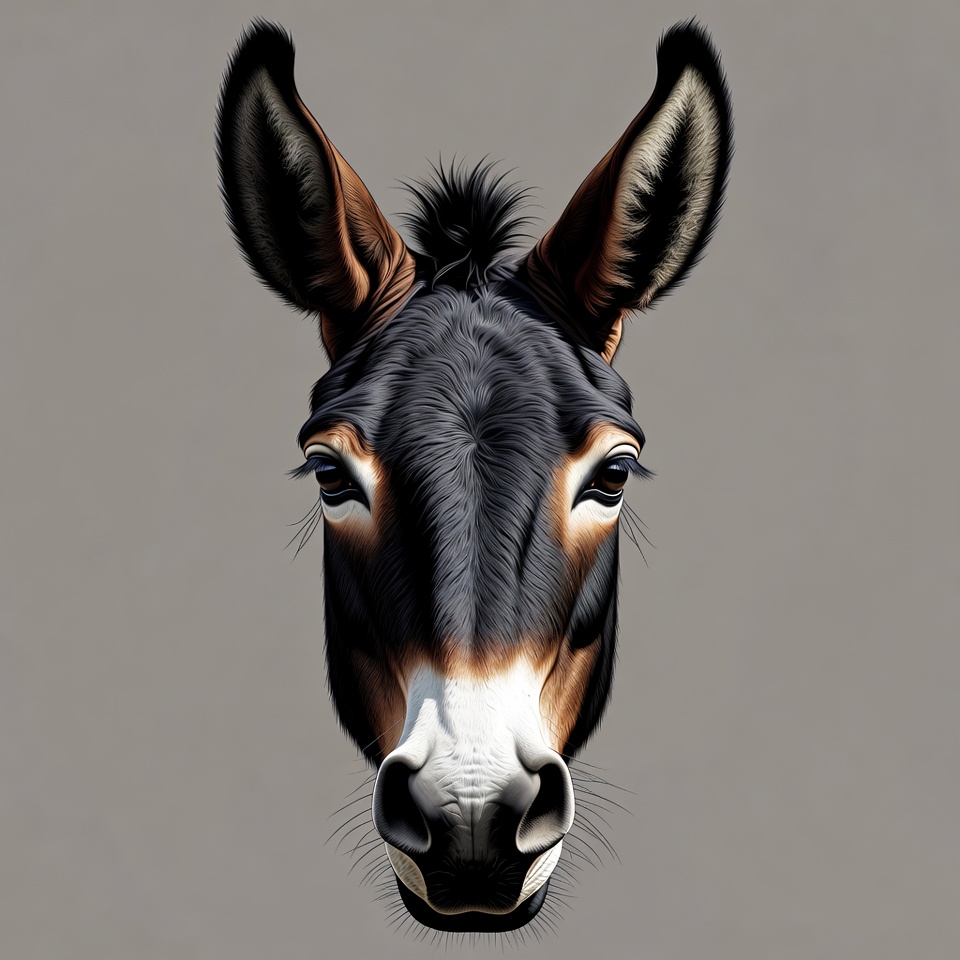 A detailed digital illustration of a donkey's head with large black ears, dark brown muzzle, and expressive eyes. The donkey faces forward against a plain gray background. White markings highlight the nose and mouth area.